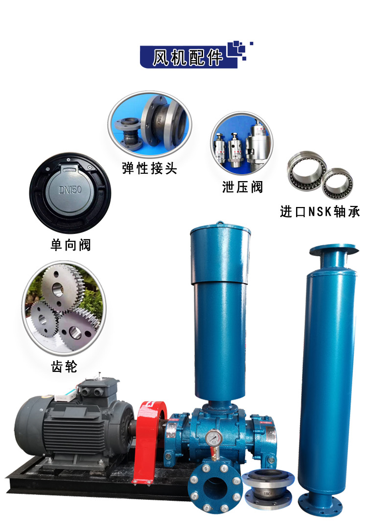 3、當(dāng)在羅茨風(fēng)機(jī)性能參數(shù)表上查得有兩種以上的鼓風(fēng)機(jī)可供選擇時,應(yīng)優(yōu)先選擇效率較高、機(jī)型較小、調(diào)節(jié)范圍較大的一種,當(dāng)然還應(yīng)加以綜合比較,權(quán)衡利弊而決定。